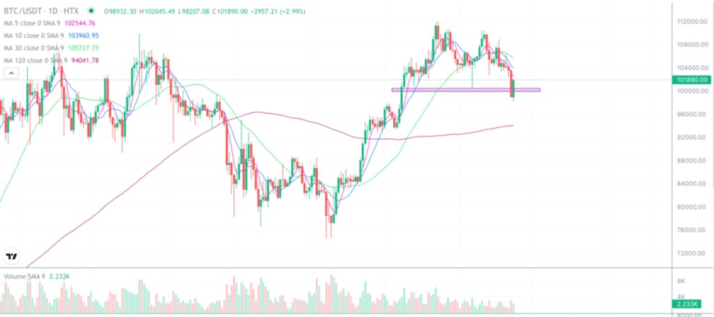 比特币跌破了十万,最低跌到了98200,但是又被快速收回来了,目前已经重新回到了十万的上方,这次不是有效跌破十万,只是插针跌破,情况还不算糟糕,如果短期不再跌破98200的低点,近期可能就要震荡反弹,有可能会反弹到105000,甚至105000的上方,但是若跌破98200的低点,那么比特币可能就要开始中期的回调了,短线抄底的98200是安全持币线。